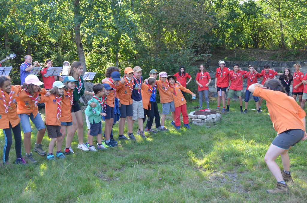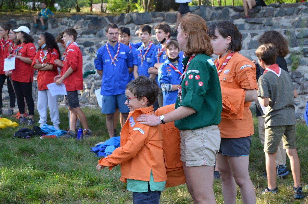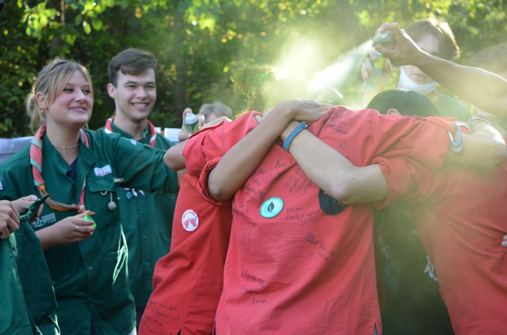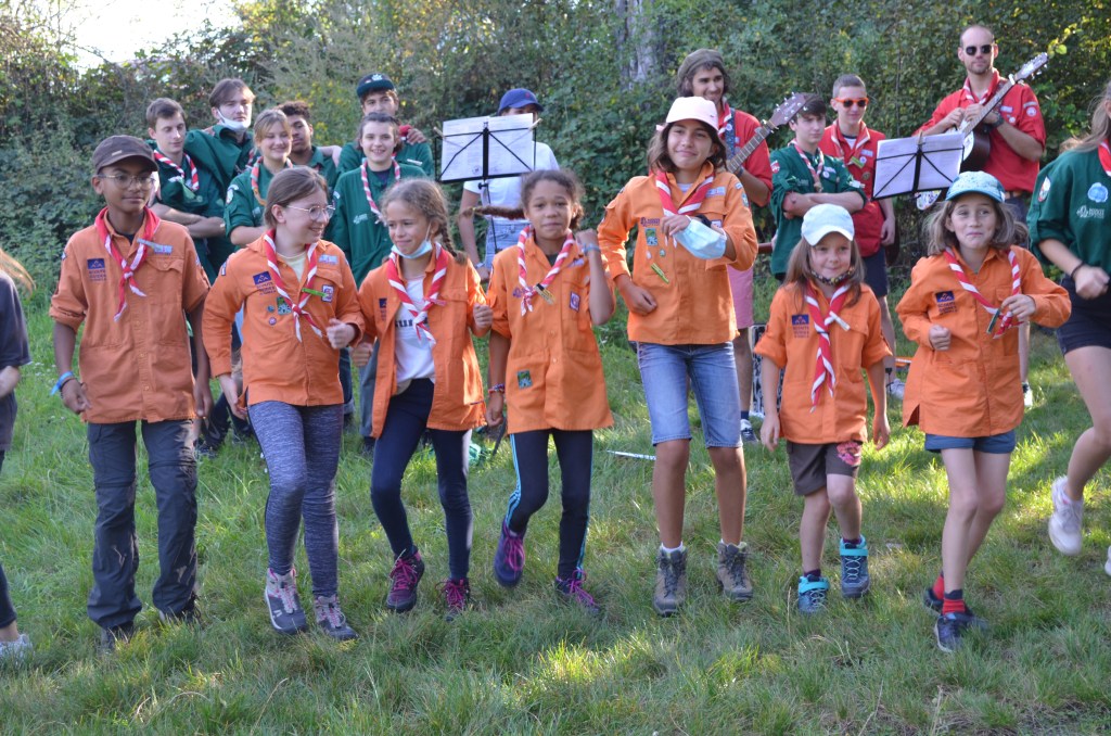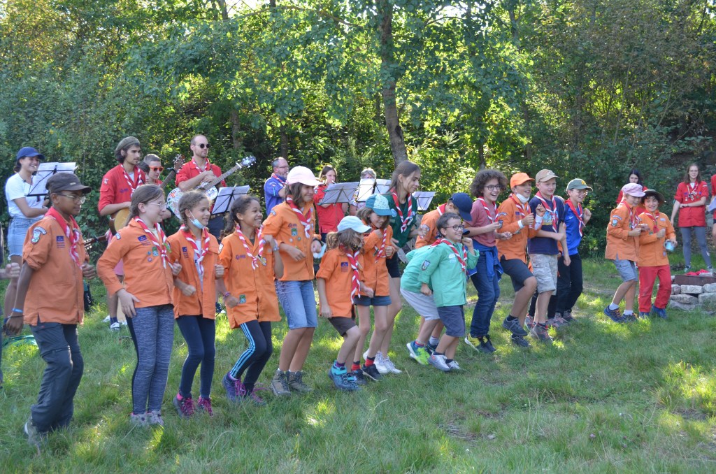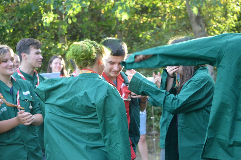 17h00, la cérémonie des Montées commence animée par les Musi’Scouts. Chaque unité a préparé le passage des nouveaux. Chez les Louveteaux, les anciens farfadets sont accueillis avec une chorégraphie qui leur explique la vie en orange. Pour les Bleus, c’est un parcours du combattant, à parcourir avec les pieds attachés, qui attend les nouvelles recrues. Cela se corse avec les rouges. Ils ont préparé le jeu du sous-marin : allongés avec un vêtement de pluie au dessus de leur tête, les nouveaux Pionniers et Caravelles ne s’attendaient pas à recevoir une douche ! Quand aux Compagnons, c’est avec les cheveux colorés en vert par leurs futurs équipiers qu’ils passent pour la première fois la chemise de la même couleur.