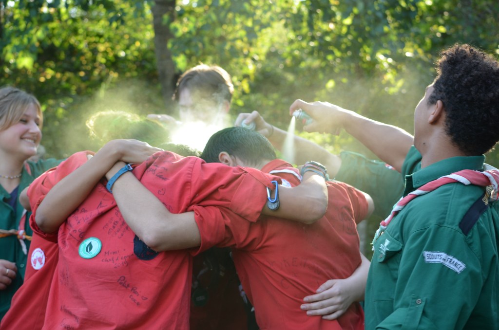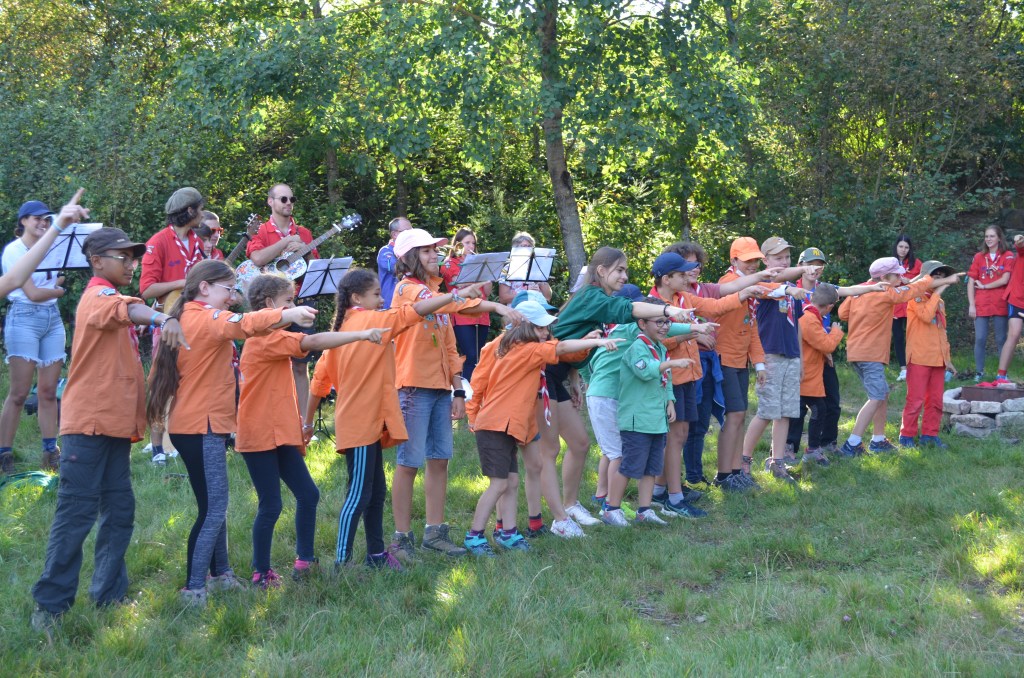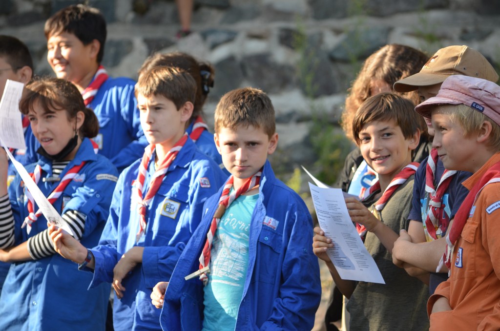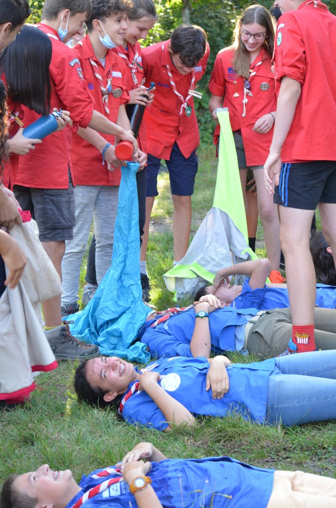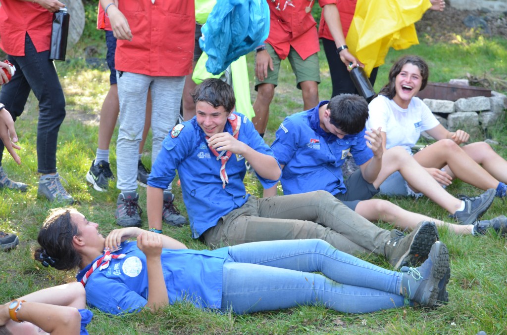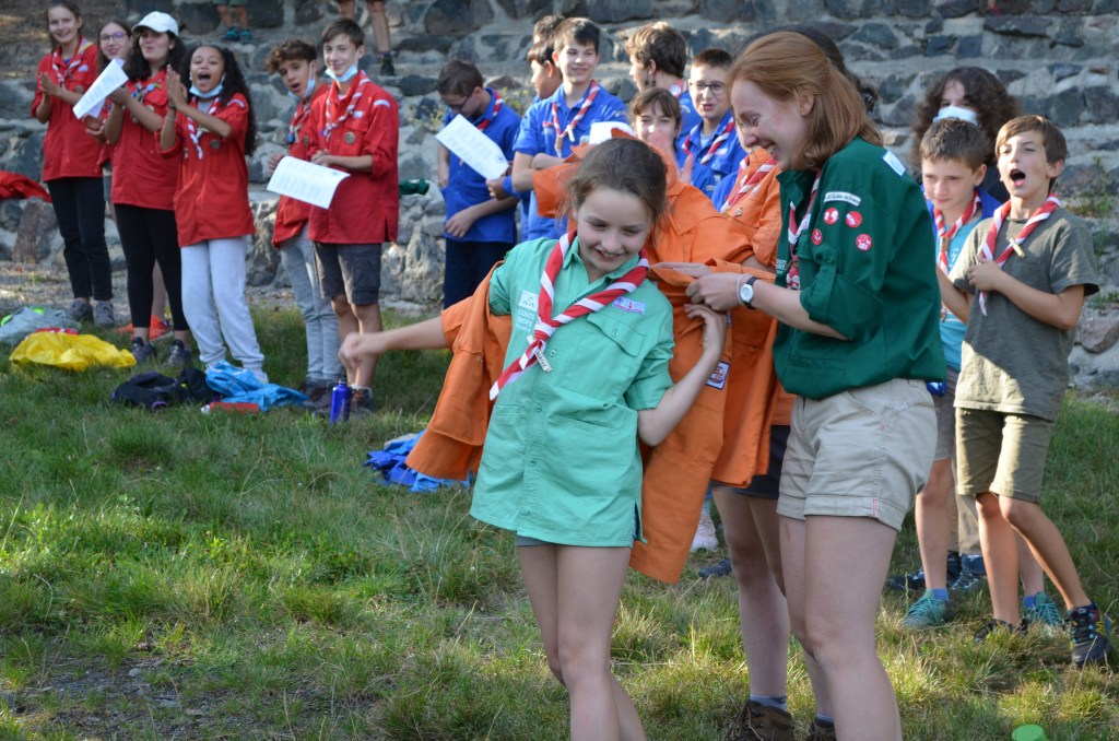 17h00, la cérémonie des Montées commence animée par les Musi’Scouts. Chaque unité a préparé le passage des nouveaux. Chez les Louveteaux, les anciens farfadets sont accueillis avec une chorégraphie qui leur explique la vie en orange. Pour les Bleus, c’est un parcours du combattant, à parcourir avec les pieds attachés, qui attend les nouvelles recrues. Cela se corse avec les rouges. Ils ont préparé le jeu du sous-marin : allongés avec un vêtement de pluie au dessus de leur tête, les nouveaux Pionniers et Caravelles ne s’attendaient pas à recevoir une douche ! Quand aux Compagnons, c’est avec les cheveux colorés en vert par leurs futurs équipiers qu’ils passent pour la première fois la chemise de la même couleur.