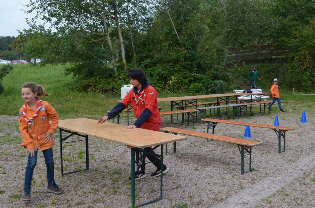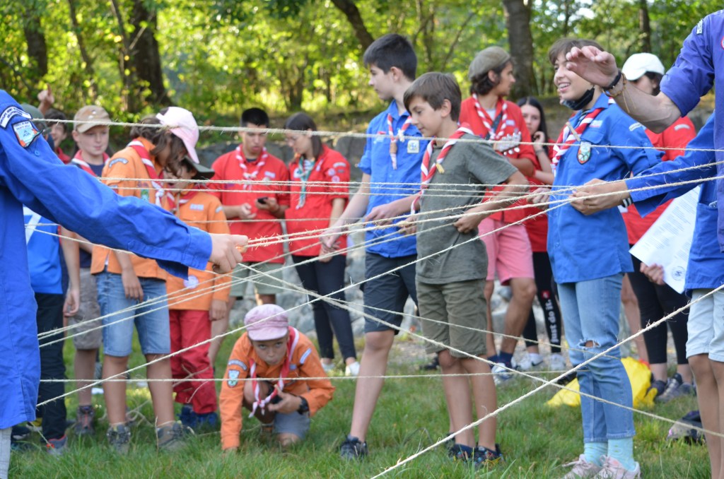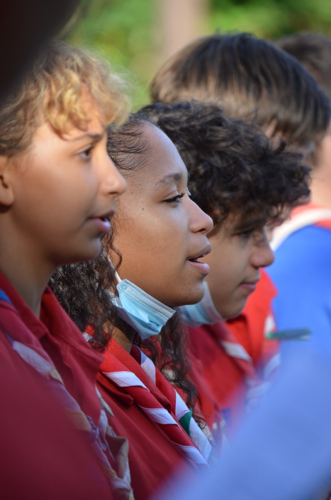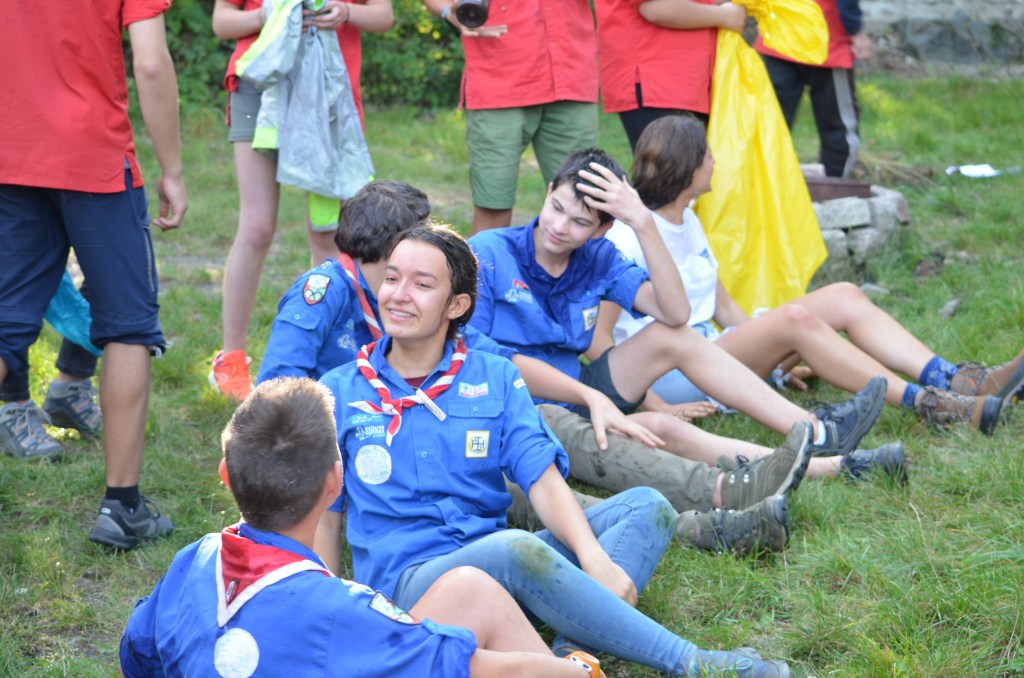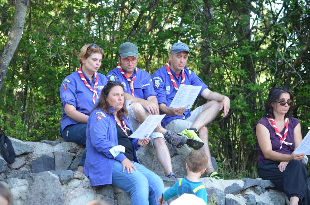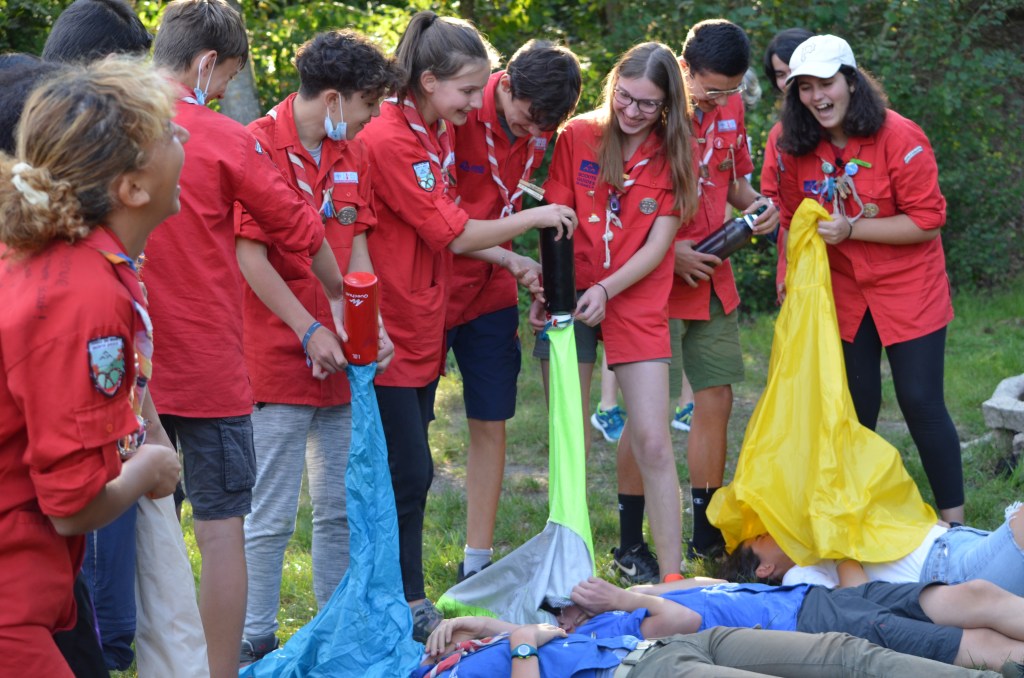 17h00, la cérémonie des Montées commence animée par les Musi’Scouts. Chaque unité a préparé le passage des nouveaux. Chez les Louveteaux, les anciens farfadets sont accueillis avec une chorégraphie qui leur explique la vie en orange. Pour les Bleus, c’est un parcours du combattant, à parcourir avec les pieds attachés, qui attend les nouvelles recrues. Cela se corse avec les rouges. Ils ont préparé le jeu du sous-marin : allongés avec un vêtement de pluie au dessus de leur tête, les nouveaux Pionniers et Caravelles ne s’attendaient pas à recevoir une douche ! Quand aux Compagnons, c’est avec les cheveux colorés en vert par leurs futurs équipiers qu’ils passent pour la première fois la chemise de la même couleur.