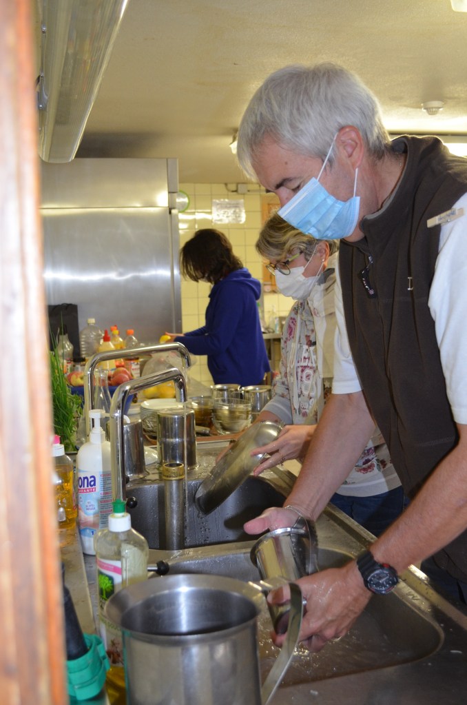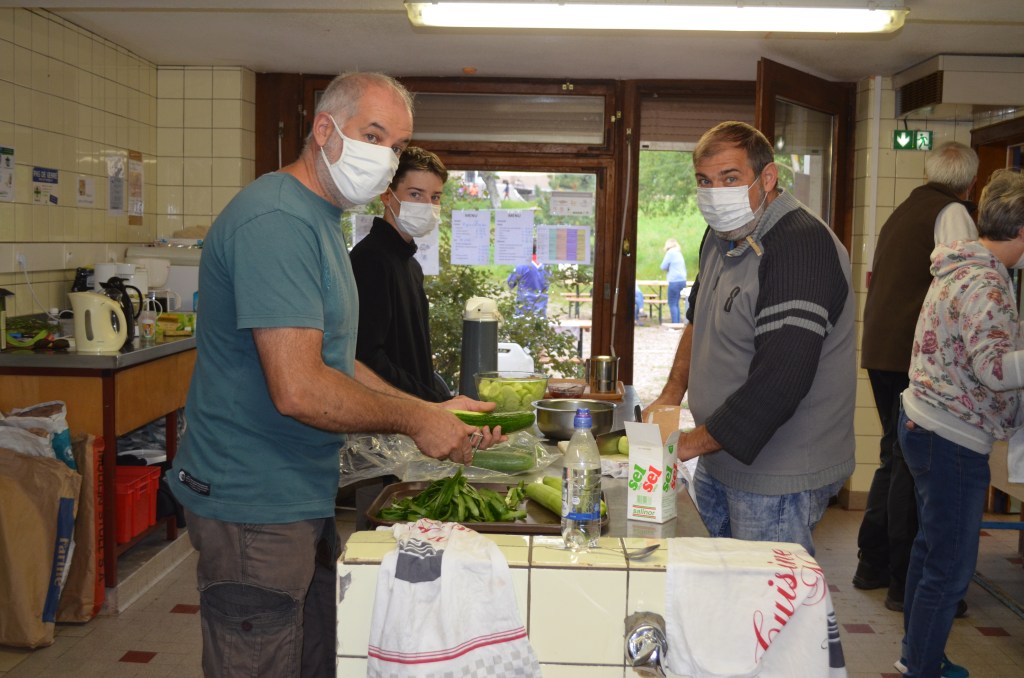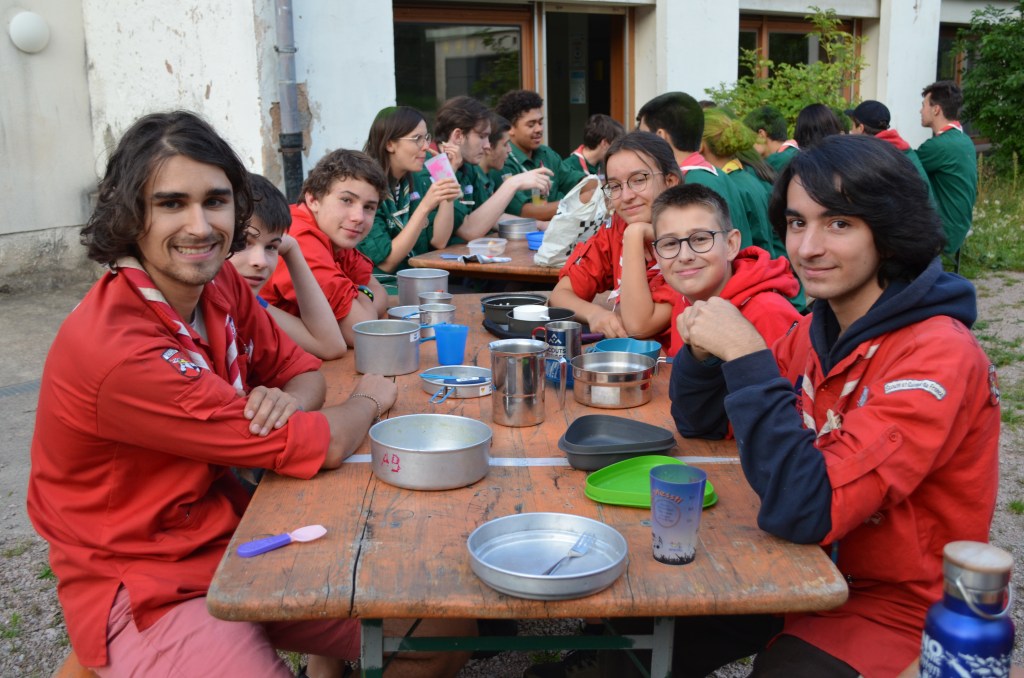 Pendant ce temps dans la cuisine, la Maîtrise de groupe et les parents bénévoles s’activent dans la bonne humeur pour préparer le déjeuner. L’ambiance est travailleuse mais joyeuse.