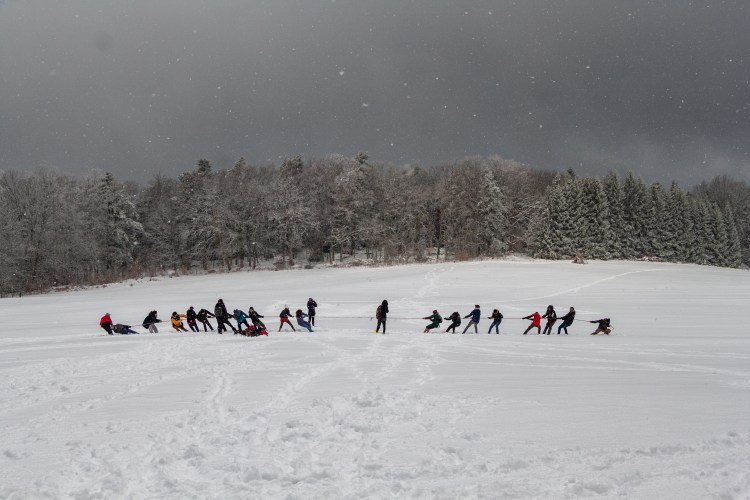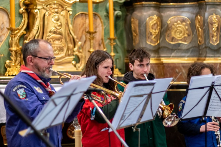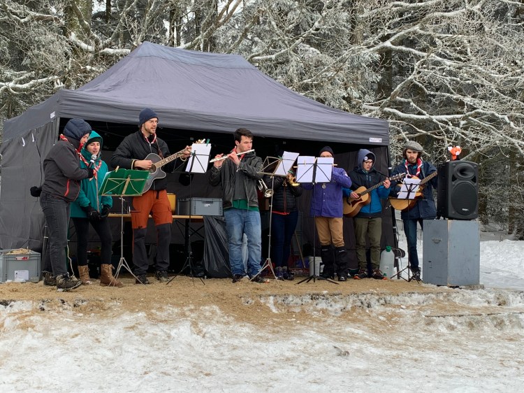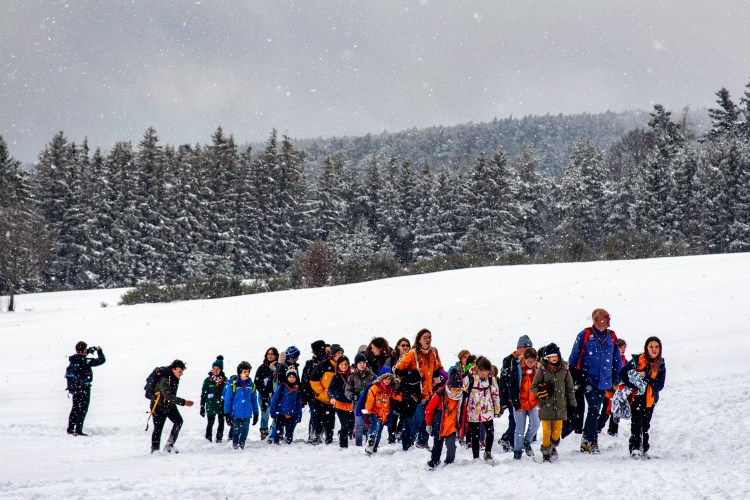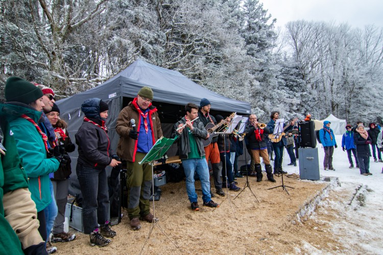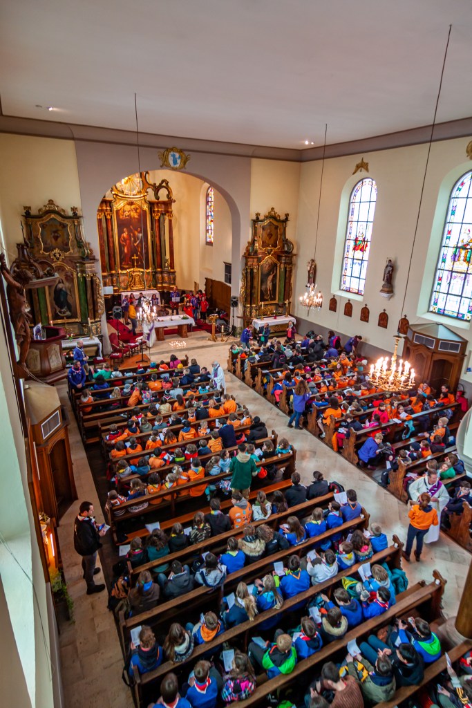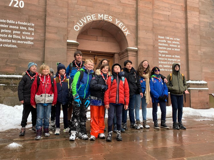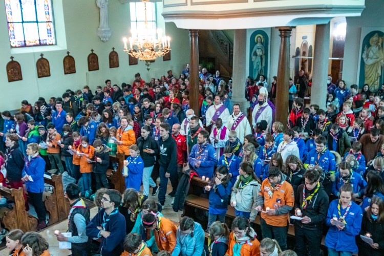 La journée a commencé par une ascension jusqu’au sanctuaire depuis la commune de Saint Nabor en empruntant le sentier des pèlerins. Les groupes se sont mises en marche au fur et à mesure et sont ensuite arrivés les uns après les autres sur le lieu de rassemblement, le grand pré en contrebas du couvent recouvert d’un épais manteau neigeux. C’est dans ces conditions particulières que se sont déroulés les jeux et animations qui avaient été préparés. Certaines unités en ont profité pour (re)visiter le sanctuaire. Puis, après un repas tiré du sac, et des chants bien connus du répertoire scout qui ont réchauffé l’ambiance hivernale, c’est à pied qu’ils sont repartis pour l’église d’Ottrott où a eu lieu la messe initialement prévue en plein air. La cérémonie a été célébrée par Mgr Gilles Reithinger, évêque auxiliaire de Strasbourg. La troupe des MusiScouts d’Illkirch s’est chargée de l’animation musicale.
